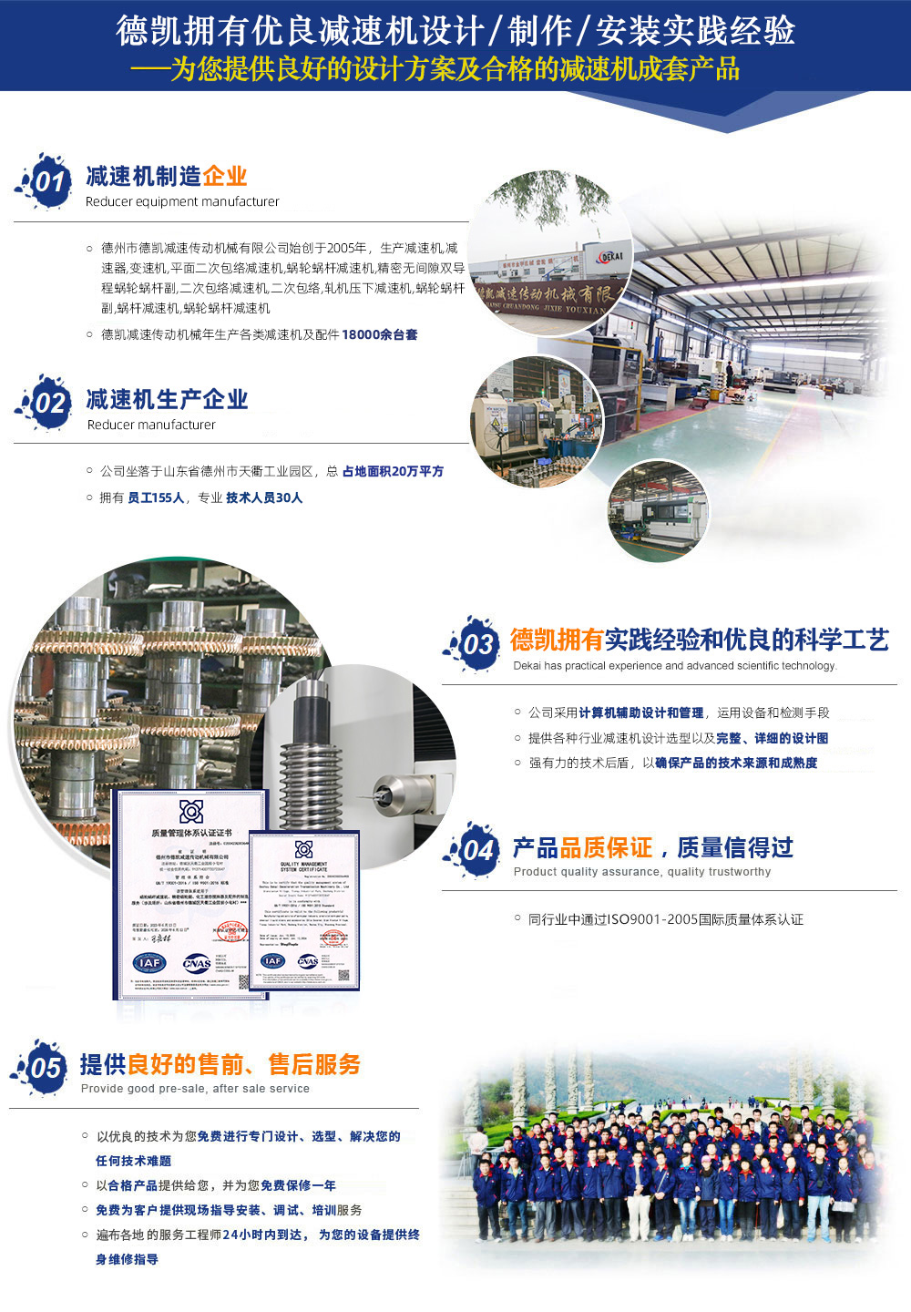 LD平台,生产减速机,减速器,变速机,平面二次包络减速机,蜗轮蜗杆减速机,精密无间隙双导程蜗轮蜗杆副,二次包络减速机,蜗轮蜗杆,轧机压下减速机,蜗轮蜗杆副,蜗杆减速机,蜗轮蜗杆减速机,公司占地面积20万平方,员工155人,技术人员30人,年生产各类减速机及配件18000余台套。在同行业中通过了ISO9001质量管理体系认证。公司设备齐全、技术力量强大、检测手段完善,引进国外大型数控二次包络机床GJK75加工数控4台,可加工到800二次包络蜗轮蜗杆。引进汉江S7732蜗杆磨床3台,精度可达5级。公司拥有辉光离子氮化炉4台,经该设备氮化后可提高蜗杆表面硬度、耐磨性高、提高疲劳强度、变形量小、耐蚀性、...